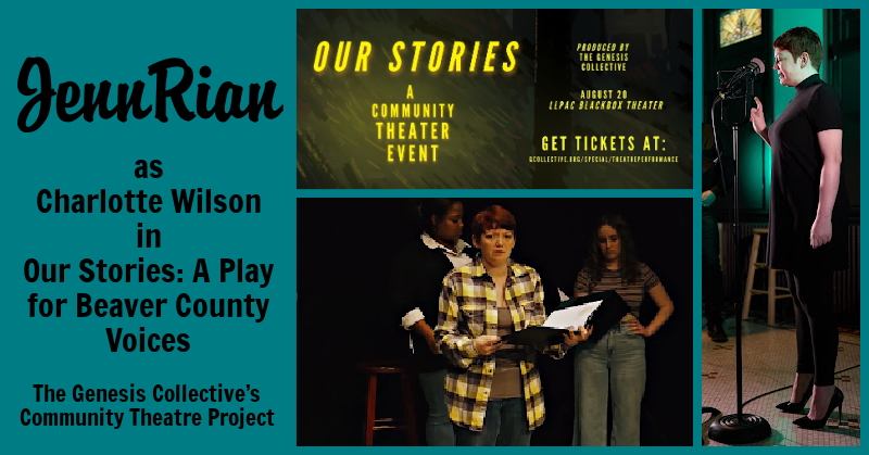(08/20/22 Lincoln Park’s Blackbox Theater) Jenn Rian plays Charlotte Wilson in “Our Stories: A Play for Beaver County Voices”, a dramatic reading based on interviews with real Beaver Countians involved in local social issues such as homelessness, food insecurity, and human trafficking.