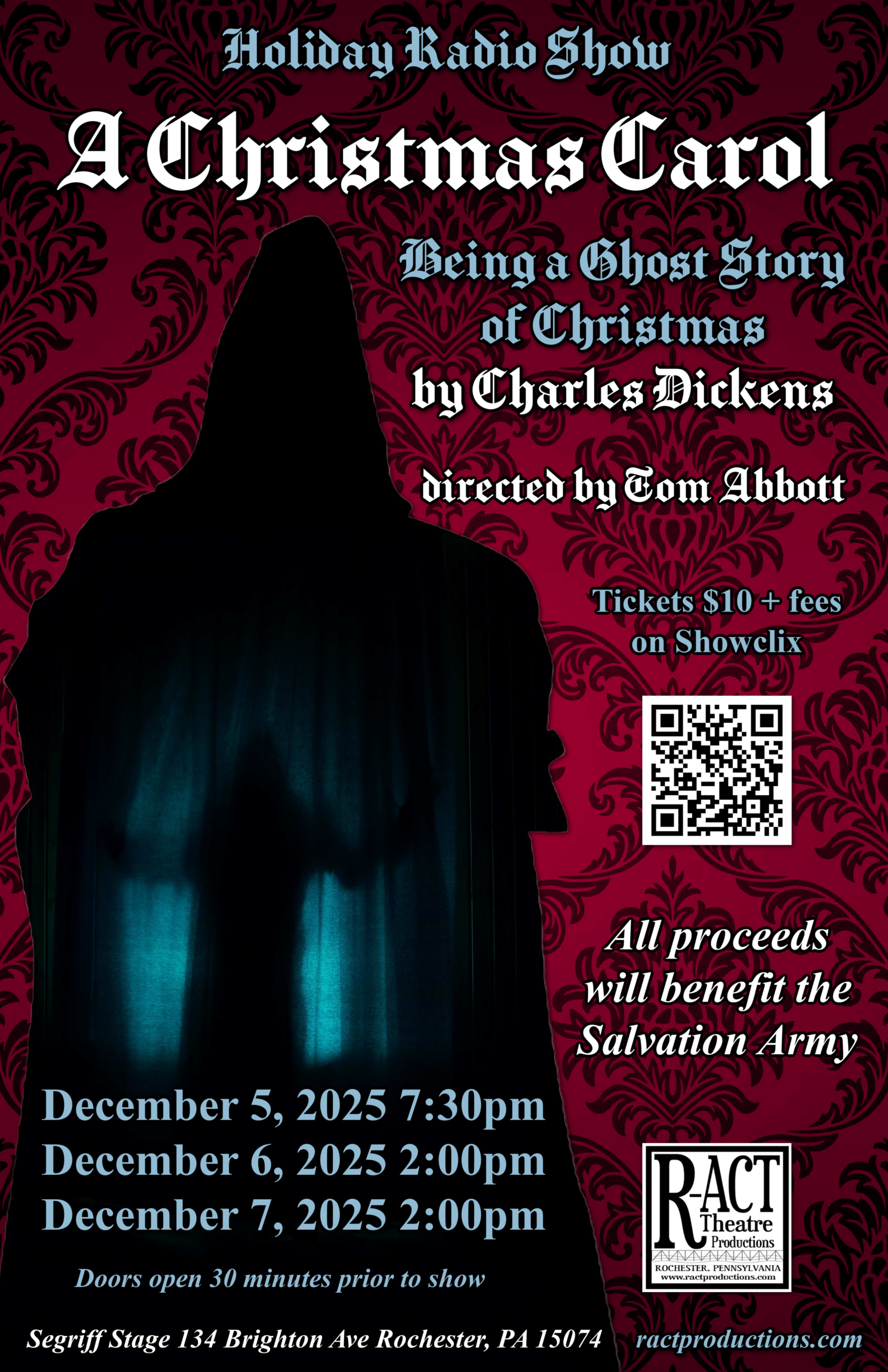 Holiday Radio Show written by Charles Dickens directed by Tom Abbott Segriff Stage December 05-07, 2025 Friday, December 05, 2025 7:30PM Saturday, December 06, 2025 2:00PM Sunday, December 07, 2025 2:00PM *Doors open 30 minutes prior to showtime. Tickets: $10 + fees on Showclix *All proceeds benefitted the Salvation Army CAST: PRODUCTION TEAM: A Christmas Carol by Charles Dickens tells the story of Ebenezer Scrooge, a miserly man who is visited by the ghosts of Christmas Past, Present, and Yet to Come. Through these supernatural visits, Scrooge undergoes a transformative journey that leads him to embrace the true spirit of Christmas. Presented in the style of a live radio broadcast from the Golden Age of radio, this production brings the classic tale to life through the artful use of live practical Foley sound effects, voice acting, and narrative. All proceeds from this production will benefit the Salvation Army.
